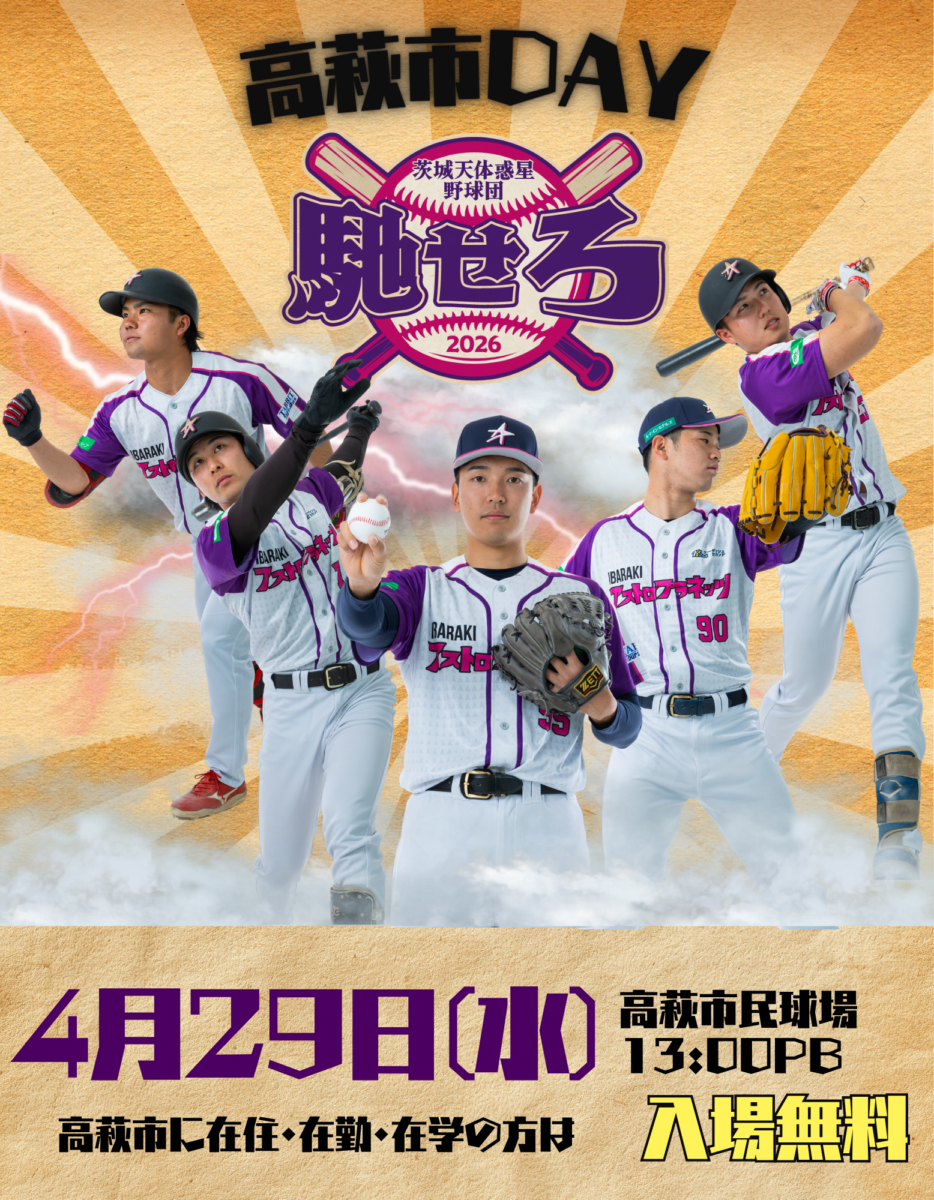 2026年4月29日(水・祝)に高萩市民球場で開催する、千葉スカイセイラーズとの公式戦についてご案内いたします
